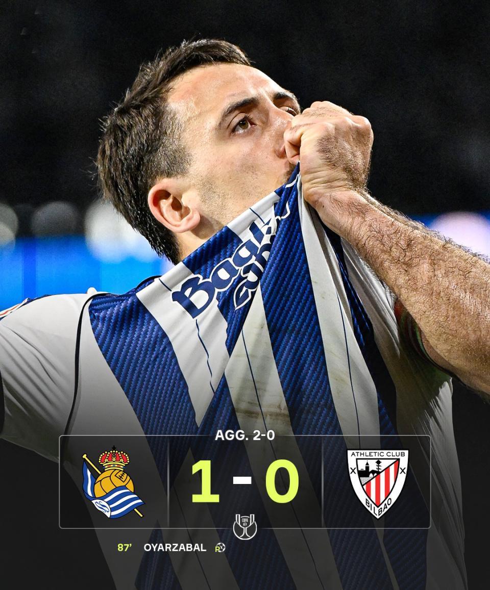 反观皇家社会,1球领先打得很有耐心,第87分钟,奥亚萨瓦尔在禁区内制造点球机会,并亲自主罚命中,皇家社会1-0领先,总比分2-0,最终比分也定格在此,皇家社会完成双杀,强势挺进决赛。
